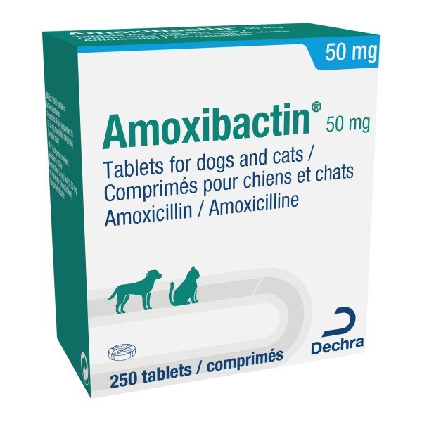 Amoxibactin 50mg tablets are used in dogs and cats for the treatment of primary and secondary infections of the airways, such as rhinitis caused by Pasteurella spp. and Streptococcus spp., and bronchopneumonia caused by Pasteurella spp., Escherichia coli and Gram-positive cocci. Treatment of primary infections of the urogenital tract, such as pyelonephritis and infections of the lower urinary tract caused by Escherichia coli, Proteus spp. and Gram-positive cocci, endometritis caused by Escherichia coli, Streptococcus canis and Proteus spp., and vaginitis as a result of mixed infections. Treatment of mastitis caused by Gram-positive cocci and Escherichia coli. Treatment of local skin infections caused by Streptococcus spp.