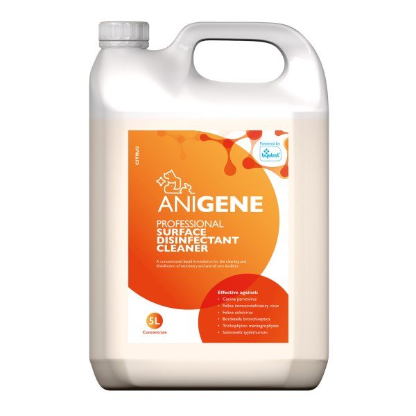 ANIGENE Professional Surface Disinfectant Cleaners are ideal for use in environments where the health and well?being of animals is of paramount importance.Byotrol provides end-users with CPD-accredited training resources designed to improve biosecurity, health, and safety in veterinary settings. Visit Byotrol.com-register for access to our training materials and workplace posters.Flexible dilution rates, ANIGENE can be used at varying dilutions, for a more flexible solution, allowing customer sites to tailor dilution rates to their specific challenges. Please check the label on pack and dilution training resources for more details.Effective outbreak management. ANIGENE is DEFRA Approved for, General Orders & Poultry OrdersAdded benefits;Manufactured in the UK to strict quality standardsEconomical dilution rates from 1%Tested and effective for both indoor and outdoor useApproved for notifiable outbreaks by Defra, DAERA and DAFMSuitable for disinfecting animal enclosures, synthetic grass and moreBiodegradable, low foam formulation is compatible with septic tanks and bio-bubblesNon-corrosive in use and compatible with wide range of materialsNo-rinse formulation reduces water consumption and minimises wasteRange utilises post-consumer recycled packagingComplies with relevant CLP, REACH and biocidal regulationsCPD-accredited training resources available to promote correct use and compliancePHMB, ammonia and phenol-free