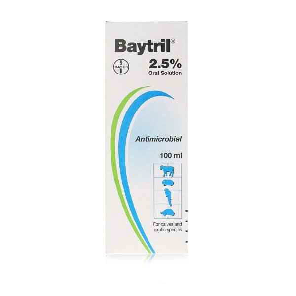 Baytril 2.5% Oral Solution is for use in calves for the treatment of infections of the alimentary and respiratory tracts of bacterial or mycoplasmal origin (e.g. pasteurellosis, mycoplasmosis, coli-bacillosis and salmonellosis), where clinical experience, supported where possible by sensitivity testing of the causal organism, indicates enrofloxacin as the drug of choice.Baytril 2.5% Oral Solution may also be used in exotic animals (small mammals, reptiles and avian species) for the treatment of bacterial infections of the alimentary and respiratory tracts where clinical experience, supported where possible by sensitivity testing of the causal organism, indicates enrofloxacin as the drug of choice.
