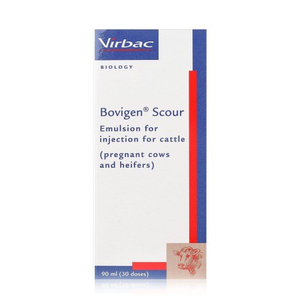 Bovigen Scour emulsion for injection is used for the active immunisation of pregnant cows and heifers to raise antibodies against E. coli adhesion F5 (K 99) antigen, rotavirus and coronavirus. When calves are fed colostrum from vaccinated cows during the first week of life, these antibodies have been demonstrated to reduce the severity of diarrhoea caused by bovine rotavirus, bovine coronavirus and enteropathogenic E. coli F5 (K99) and to reduce the shedding of virus by calves infected with bovine rotavirus or bovine coronavirus. Onset of immunity: Passive immunity commences with colostrum feeding and is dependent on calves receiving sufficient colostrum after birth.