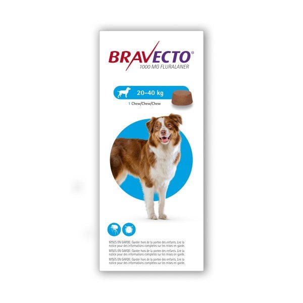 Bravecto Chewable Tablets for Dogs is used for the tratment of flea and tick infestations. It provides immediate and persistent flea and tick killing activity for 12 weeks, Fleas and ticks must attach to the host and commence feeding in order to be exposed to the active substance. The onset of effect is within 8 hours of attachment for fleas (C. felis) and 12 hours of attachment for ticks (I. ricinus).Bravecto is a chewable tablet and is well accepted by most dogs. If the tablet is not taken up voluntarily by the dog it can also be given with food or directly into the mouth. The dog should be observed during administration to confirm that the tablet is swallowed.For optimal control of flea infestation, the veterinary medicinal product should be administered at intervals of 12 weeks. For optimal control of tick infestation, the timing of retreatment depends on the tick species. For use in dogs from 8 weeks of age only.