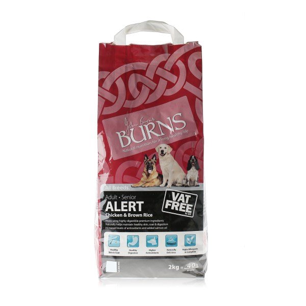 Burns Alert is a food for working dogs but with a difference. Foods for working dogs are traditionally formulated using high levels of fat and protein to meet the energy demands of heavy physical activity.For many, if not most working dogs, work requires mental alertness and low or moderate physical activity; they must also be calm, well-behaved and attentive. For example, this would apply to dogs which assist people with disabilities of sight, hearing or PAT dogs. For them, a low energy diet is indicated most of the time.Burns Canine Alert is formulated to meet those demands. Protein and fat levels are controlled; this promotes excellent physical and mental health. Levels of antioxidants and omega 3 fats are increased; this helps to neutralise free radicals which can inhibit brain function.Working dog foods also tend to use low quality ingredients to keep the cost low. At Burns we believe that high quality ingredients promote good health. This ensures optimum performance and is more economical in the long run.Suitable for adult dogs 6 months+.Ingredients:Brown Rice (Min 63%), Chicken Meal (Min 20%), Oats, Peas, Fish Oil, Chicken Oil, Minerals & Vitamins, Seaweed, Chicken Liver, Green Tea Extract, Grapeseed Extract.
