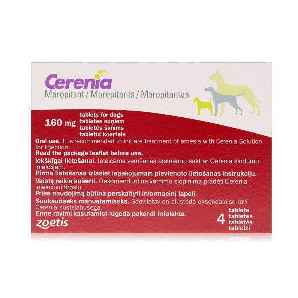 Cerenia Tablets are used for the prevention of nausea induced by chemotherapy and treatment and prevention of vomiting in dogs aged over 8 weeks. Cerenia tablets should be administered once daily, at a dose of 2 mg maropitant per kg bodyweight, using the number of tablets given in the table below. Tablets are breakable along the score line on the tablet.To prevent vomiting, tablets should be given more than 1 hour in advance. The duration of the effect is approximately 24 hours and, therefore, tablets can be given the night before administration of an agent that may cause emesis (e.g. chemotherapy). A light meal or snack before dosing is recommended; prolonged fasting before administration should be avoided. Cerenia tablets should not be administered wrapped or encapsulated in food as this may delay dissolution of the tablet and consequently the onset of the effect.