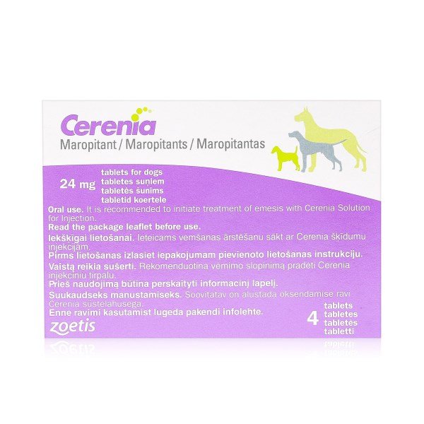 Cerenia Tablets are used for the prevention of nausea induced by chemotherapy and treatment and prevention of vomiting in dogs aged over 8 weeks. Cerenia tablets should be administered once daily, at a dose of 2 mg maropitant per kg bodyweight, using the number of tablets given in the table below. Tablets are breakable along the score line on the tablet.To prevent vomiting, tablets should be given more than 1 hour in advance. The duration of the effect is approximately 24 hours and, therefore, tablets can be given the night before administration of an agent that may cause emesis (e.g. chemotherapy). A light meal or snack before dosing is recommended; prolonged fasting before administration should be avoided. Cerenia tablets should not be administered wrapped or encapsulated in food as this may delay dissolution of the tablet and consequently the onset of the effect.