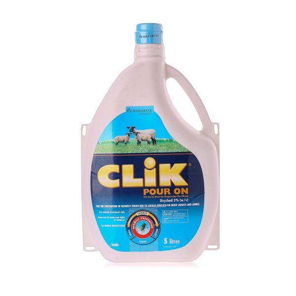 Clik 5% Pour-On Suspension is a ready-to-use formulation indicated for the prevention of blowfly strike in sheep. Clik has an advanced Rain-Lock' formulation which uses suspo-emulsion technology, this allows Clik to bind tightly to the grease in wool fibres and resist washing out so it provides season-long protection.Recommended dose volumes correspond to 0.6ml- 2ml per kg of bodyweight, it is important to check the label to ensure the correct dose is administered. Clik Pour-On Suspension is for external use only and should be applied using a automatic dosing gun with a spray nozzle.Please see packaging for withdrawal periods