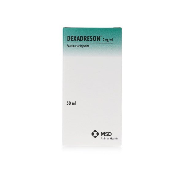 ml Solution for Injection may be used whenever a parenteral corticosteroid preparation giving a medium duration of activity is indicated. It can be used as an anti-inflammatory and anti-allergic agent in horses, cattle, pigs, dogs and cats and for the treatment of primary ketosis in cattle. The product can also be used to induce parturition in cattle. Dexadreson is suitable for intravenous use in the horse and is thus of particular benefit in cases needing emergency treatment.This preparation contains the sodium phosphate ester of dexamethasone, a fluoro-methyl derivative of prednisolone, which is a potent glucocorticoid with minimal mineralocorticoid activity. Dexamethasone has ten to twenty times the anti-inflammatory activity of prednisolone.Following intramuscular injection this soluble ester of dexamethasone is rapidly absorbed and hydrolysed to the parent alcohol giving a prompt response which is maintained for approximately 48 hours.Recommended Dosage and AdministrationDexadreson may be administered by intravenous or intramuscular injection in horses, and by intramuscular injection in cattle, pigs, dogs and cats. The product may also be given by intra-articular injection in horses. Normal aseptic technique should be observed. To measure small volumes of less than 1 ml a suitably graduated syringe should be used to ensure accurate administration of the correct dose.Please see datasheet for detailed dosages, administrations and warnings.