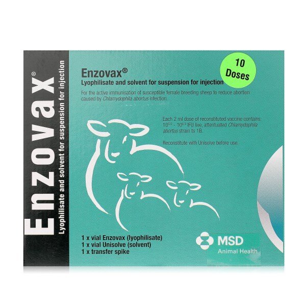 Enzovax is indicated for the active immunisation of susceptible female breeding sheep to reduce abortion caused by Chlamydophila abortus infection. Challenge studies have demonstrated that protection against Enzootic abortion and excretion of Chlamydophila abortus post-challenge is undiminished for at least three years post vaccination with Enzovax. Field studies in endemically infected flocks maintaining a policy of vaccinating incoming ewes with Enzovax indicate that enzootic abortion levels remain very low in ewes vaccinated 4 years previously. If the abortion rate remains unchanged in flocks which have been vaccinated with Enzovax it is recommended that veterinary advice is sought.Do not vaccinate pregnant animals. Do not vaccinate animals less than 4 weeks before mating. Do not vaccinate animals which are being treated with antibiotics.The recommended dose of Enzovax is 2 ml by intramuscular or subcutaneous injection; however please see the datasheet for more detailed dosages, administrations and user warnings.