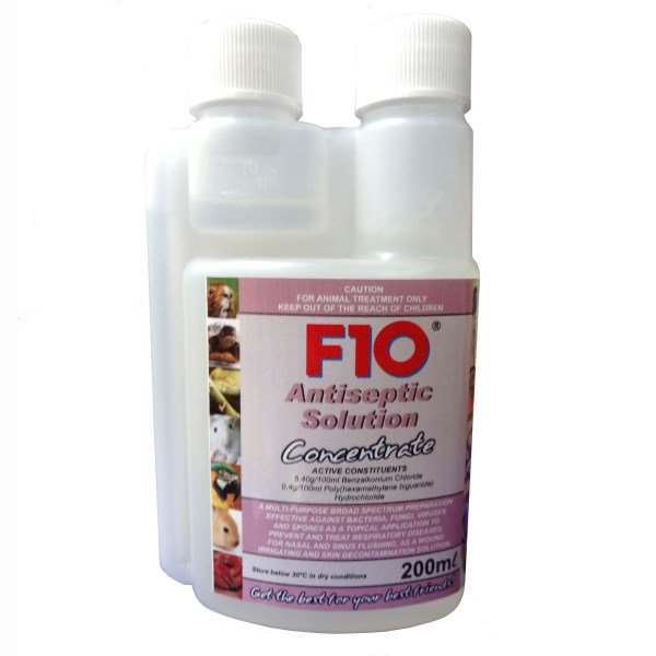 F10 Antiseptic Solution is a multi-purpose broad spectrum preparation effective against a wide range of bacteria, fungi, viruses and spores.Uses:Wound Irrigation and Treatment: Remove contamination as necessary. Prepare a 1:250 F10 Antiseptic Solution using normal saline and irrigate the wound site as required. Dressings can be soaked in the Antiseptic Solution and bandaged over the wound site.Abscesses: Can be used to flush out abscesses using a prepared solution at a ratio of 1:250.Respiratory Conditions: Nebulise using a 1:250 F10 Antiseptic Solution made with distilled water for a period of 20-30 minutes once or twice daily for as long a period as determined by response to therapy. F10 Antiseptic Solution has not been shown to interfere with other medication concurrently delivered by nebulisation.Sinus and Nasal Flushing: For the removal of accumulated mucous, inflammatory material and the control of infection. Use a 1:250 of F10® Antiseptic Solution made with normal saline.Oral Use: A 1:500 to 1:1000 solution of has been shown to be effective as a crop lavage for the treatment of yeast and bacterial infections. Administer by gavage tube.Skin, Scale and Feather Decontamination: Treat the patient by spraying, soaking or washing with a 1:250 F10® Antiseptic Solution or by placing it in a nebulising chamber until the body surface is thoroughly moistened. Leave to air dry.