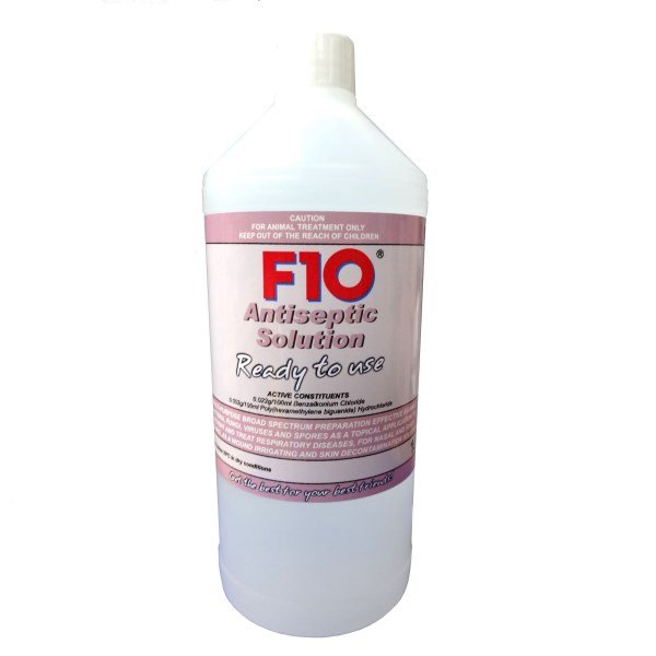 F10® Antiseptic Solution is a multi-purpose broad spectrum preparation, effective against a wide range of bacteria, fungi, viruses and spores.It can be used as part of the treatment, or to help prevent (re-)infection, in a variety of clinical situations including wound irrigation and nebulisation.It is licensed under the Exemption for Small Pet Animals (see below).Available in as a concentrate in 200ml and 1 litre bottles, or in 1 litre 'ready-to-use' bottles (pre-diluted to a 1-250 concentration).Uses for F10® Antiseptic SolutionUse as a topical application to treat and help prevent re-infection in a variety of clinical situations.Wound irrigation and treatment- Remove gross contamination as necessary. Prepare a 1-250 F10® Antiseptic Solution using normal saline and irrigate the wound site as required. Dressings can be soaked in the Antiseptic Solution and bandaged over the wound site.Abscesses may also be flushed out using a prepared 1-250 solution. Abraded or inaccessible areas not suitable for high volume flushing can be sprayed with the Antiseptic Solution and allowed to dry.Large volume lavage- Where required a 1-250 solution can be used within the abdominal cavity as an antiseptic lavage in cases of sepsis, organ perforation or rupture or inadvertent leakage during surgery. Excess liquid should be removed before closure.Soaking of surgical swabs for placing under organs during surgery to reduce bacterial contamination following potential fluid leakage.Respiratory conditions- Nebulise using a 1-250 F10® Antiseptic Solution made with distilled water for a period of 20-30 minutes once or twice daily for as long a period as determined by response to therapy. F10® Antiseptic Solution has not been shown to interfere with other medication concurrently delivered by nebulisation.Sinus and nasal flushing- For the removal of accumulated mucous, inflammatory material and the control of infection. Use a 1-250 of F10® Antiseptic Solution made with normal saline. Restrain the animal with its head downwards to avoid aspiration and syringe the cavity as required.Oral use- A 1-500 to 1-1000 solution can be used as a crop lavage.Skin, scale and feather decontamination- Treat the patient by spraying, soaking or washing with a 1-250 F10® Antiseptic Solution or by placing it in a nebulising chamber until the body surface is thoroughly moistened. Leave to air dry. Full body emersion in a 1-3000 solution has been shown to be effective at treating skin problems in some species of reptile and amphibians.