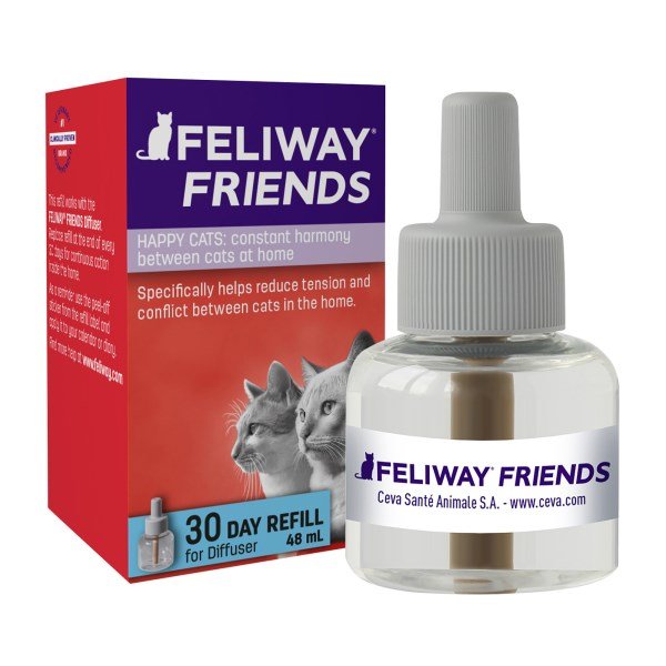 Feliway Friends is an easy to use plug-in containing the cat appeasing 'pheromone' which is proven to help restore harmony between household cats. This pheromone helps the kittens feel safe and secure and promotes a bond between them and their mother. Feliway Friends is clinically proven to help reduce tension and conflicts between cats in multi-cat households. The Feliway Friends Refill requires the Feliway Friends Diffuser