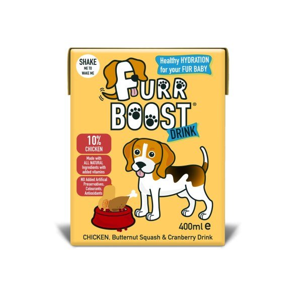Chicken, Butternut Squash and Cranberry Furr Boost Dog Drink. 100% Natural, hydrating smoothie drink for dogs, made with real Chicken, Butternut Squash and Cranberries, with added Salmon, Flaxseed and Coconut Oils and Vitamins",