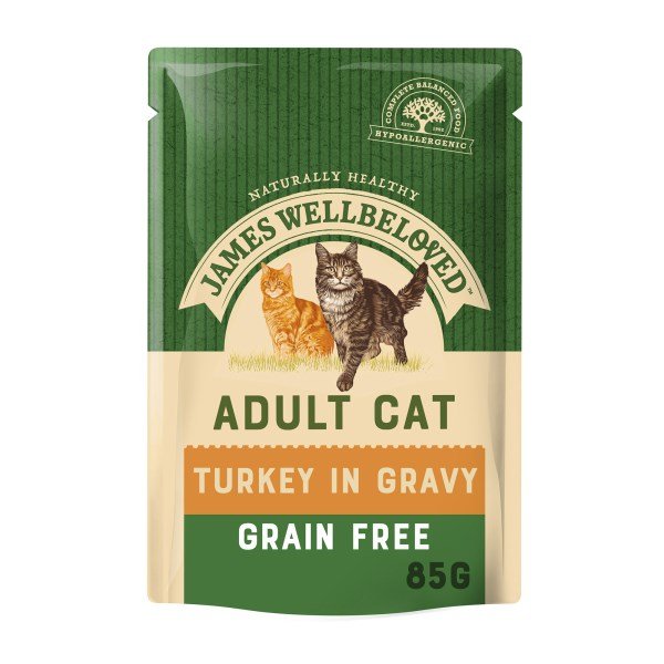 James Wellbeloved Turkey Pouches are a complete dietetic and hypo-allergenic wet food for adult cats between the age of 1-7.Benefits:Tasty turkey chunks in a delicious sauceContains selected protein and carbohydrate sourcesExcellent for the reduction of ingredient and nutrient intolerancesContains no added artificial colours, flavours or preservatives, no beef, no pork, no wheat or wheat gluten, no dairy products, no egg and no soyaIngredients:turkey meats, pea protein, tomato pomace, cassava, potato flakes, sunflower oil, linseed oil, calcium carbonate, potassium chloride, chicory extract, xylose, cranberry extract, yucca extractMinimum levels: turkey (35%), tomato pomace (1%), cranberry extract (130mg