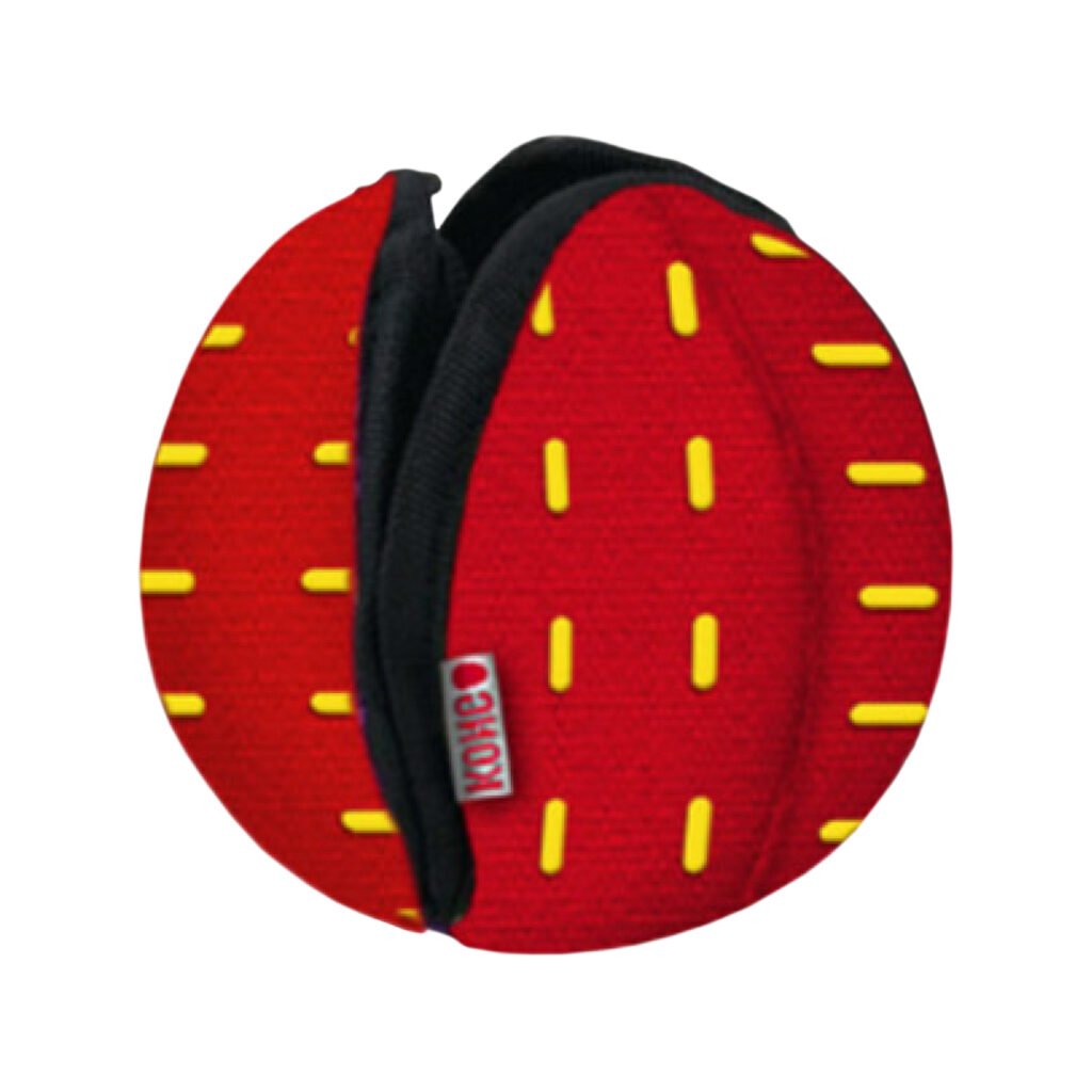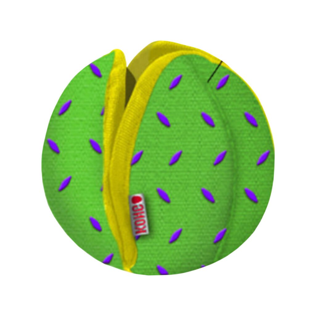 KONG Ballistic Hide ’N Treat brings treat dispensing fun to the KONG Ballistic family. This durable plush toy, delivers two-in-one action, as a mentally challenging treat puzzle and doubling as a fetch toy when closed. Ballistic Hide ’N Treat is designed with heavy-duty pockets and non-abrasive Velcro® enclosures to hide treats and occupy dogs through varying levels of difficulty while providing a comfortable chewing experience. Open the pockets for an easy challenge and close to increase the difficulty. Want to add to the play session? Close completely to turn the toy into a ball-shaped fetch toy. A reinforced wipeable canvas make this toy easy to clean while standing-up to tough play sessions for long-lasting fun.