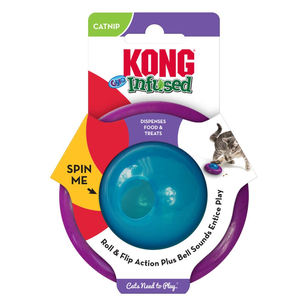 The KONG Cat Gyro is the ideal food and treat dispenser that has a roll and spin action that, engages cats’ in a mentally stimulating food puzzle. When batted, it flips over, sparking cats’ stalking and pouncing instincts. Infused with potent KONG North American Premium Catnip oil, it also features a bell in the outer ring both combining to extend play sessions. Its removable middle container is easy to fill and clean. Holds 1/3 cup of food, making it an ideal bowl replacement.