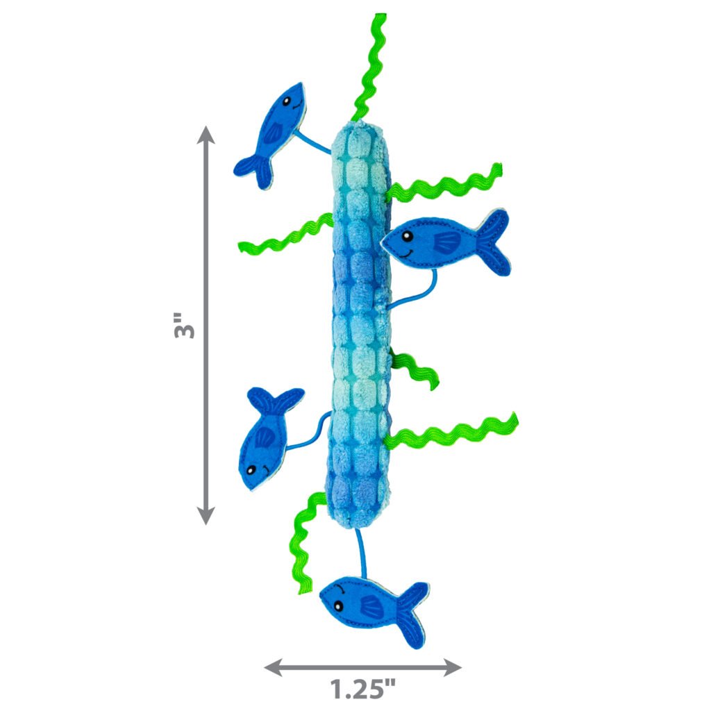 KONG Kickeroo Stickaroo delivers multi-sensory enrichment in a long soft, shape that encourages healthy full-body wrestling and hind paw kicking. Squiggly seaweed and a school of eye-catching shiny fish tethered with elastic invite dynamic batting and pouncing for “undersea” adventures. They’re also great for rewarding catch and capture instincts. Crackle sounds and KONG Premium North American Catnip throughout the stick encourage natural, satisfying fun with every move.