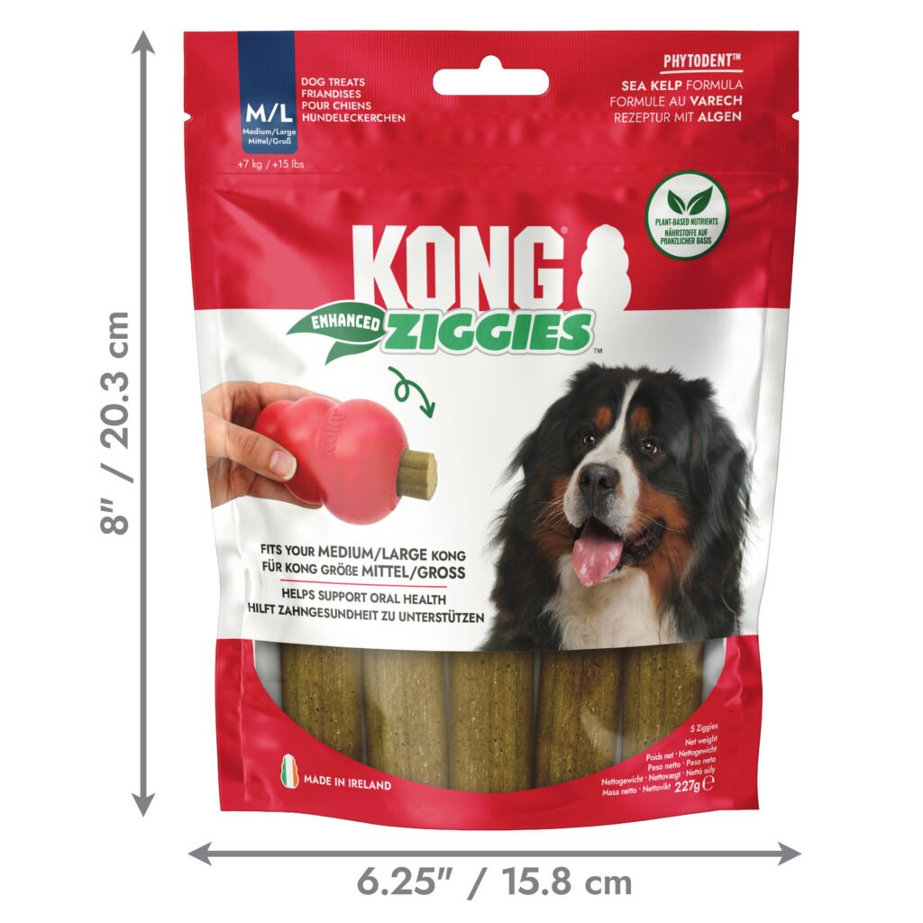 KONG Ziggies naturally delicious chews are specially designed and formulated to support dogs’ oral health. Firm texture and ridges effectively help push away plaque through the mechanical action of chewing, massage gums, and remove leftover food from dogs’ teeth, for fresh breath and bright smiles. With naturally delicious flavor dogs can’t resist, these chews are enriched with PhytoDent™ seaweed that’s packed with antioxidants, vitamins, minerals, and proteins. Plant-based and made without added wheat, corn, or soy, Ziggies are ideal as a treat or for stuffing inside a KONG Classic to extend daily dental care.