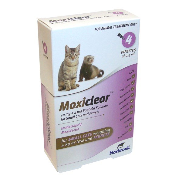 Moxiclear 40mg Spot-On Solution for Small Cats and Ferrets is for catssuffering from, or at risk from, mixed parasitic infections: For the treatment and prevention of flea infestation (Ctenocephalidesfelis), the treatment of infections with gastrointestinal nematodes (L4 larvae, immature adults and adults ofToxocaracatiandAncylostomatubaeforme). the prevention of heartworm disease (L3 and L4 larvae ofDirofilariaimmitis), the treatment of notoedric mange (Notoedrescati), the treatment of ear mite infestation (Otodectescynotis), The product can be used as part of a treatment strategy for flea allergy dermatitis (FAD). For ferretssuffering from, or at risk from, mixed parasitic infections: For the treatment and prevention of flea infestation (Ctenocephalidesfelis), the prevention of heartworm disease (L3 and L4 larvae ofDirofilariaimmitis).
