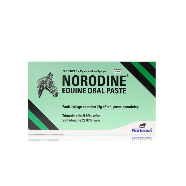 Norodine Equine Paste is indicated for use in the treatment of bacterial infections in horses caused by sensitive microorganisms including: Escherichia coli, Rhodococcus (Corynebacterium) equi, Staphylococcus spp and Streptococcus spp.Norodine Equine Paste may be effective in treating the following conditions. Alimentary tract infections including diarrhoea. Respiratory infections including pneumonia, pleurisy, strangles. Wounds, septicaemia and general infections.The daily dose is 30mg combined active ingredients per kg bodyweight. Each syringe provides one daily dose for a 500kg horse. Each division on the dial-a-dose plunger provides sufficient product to treat 50kg of bodyweight.Treatment should be continued for up to five days or until two days after symptoms have resolved. Drug absorption may be greater if food is withheld for a few hours prior to dosing.Not to be used in horses intended for human consumption. Treated horses may never be slaughtered for human consumption. The horse must have been declared as not intended for human consumption under national horse passport legislation.