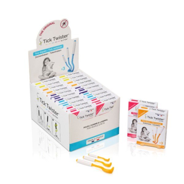The O'Tom Tick Twister® with silicone grip handle is ideal for use when hands are wet.FeaturesEach display box contains 20 packsEach pack contains 3 Tick Twister®, micro, small and largeCradles the tick's body without compressing the abdomenMinimises the transfer of tick-borne infectionsRemoves the tick quickly and without any painCan be used on people and animalsCan be disinfected or sterilisedMade from recyclable plasticCan be incinerated without producing pollutant chlorine fumes