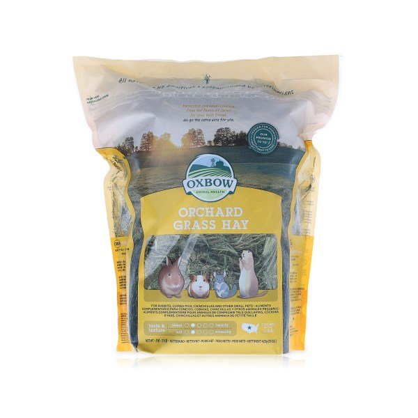 Orchard Grass is bunny delight! Aromatic, flat bladed and a wonderful colour and taste! Oxbow Orchard Grass is a green, fruity-smelling grass hay which many small animals just love. It looks similar to timothy grass, but is generally lacking in a coarse stem. This creates a soft bladed grass hay. Orchard Grass is a perennial cool season grass, and leaves vary in colour from green to bluish-green depending on the maturity of the plant at the time of harvest. A later harvest can also bring in some brownish colour too. Orchard Grass is high in fibre, low in protein, and low in calcium. It can be freely fed to rabbits, guinea pigs and other small animals of any age.