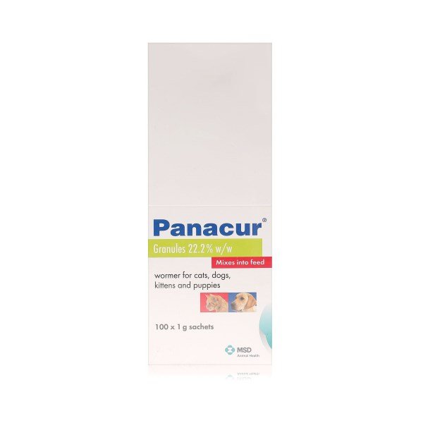 Panacur is used for the treatment of domestic dogs and cats infected with immature and mature stages of nematodes of the gastro-intestinal and respiratory tracts. In adult dogs and cats: For the treatment of adult dogs and cats infected with gastro-intestinal nematodes and cestodes. In puppies and kittens: For the treatment of weaned puppies and kittens infected with gastro-intestinal nematodes and puppies infected with protozoa (Giardia spp). In pregnant dogs: For the treatment of pregnant dogs to reduce prenatal infections with Toxocara canis and the transfer of T.canis and Ancylostoma caninum to their pups via the milk. Also for the treatment of dogs infected with lungworm Oslerus (Filaroides) osleri or protozoa Giardia spp. and cats infected with lungworm Aelurostrongyles abstrusus. Panacur also has an ovicidal effect on nematode eggs.