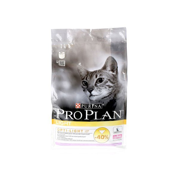 Complete pet food for overweight adult cats.Less active cats or overweight cats need a specific diet to help with weight loss and to maintain a stable body weight. Rich in turkey and rice, Pro Plan Light is a highly palatable food formulated to provide complete and balanced nutrition with a reduced level of fat (40% less vs. adult formula), promoting a lean body condition. Pro Plan Light is rich in antioxidants to help support a healthy immune system, which may be be compromised in an overweight cat. The special nugget shape and texture of the kibble also help reduce plaque and tartar build up. Additionally, helping to support and maintain healthy kidneys is key for your cat's health and wellbeing in adulthood. Purina veterinarians and nutritionists have developed Optirenal, a specific combination of nutrients included in Pro Plan Light. These nutrients help support your cat's kidney function, helping slow down the ageing process.Ingredients and Analysis:Turkey (16%), maize gluten meal, rice (14%), soya meal, wheat gluten meal, maize, dehydrated poultry protein, wheat, beet pulp, fish oil, animal fat, digest, yeast, dried egg, minerals. Nutritional Additives: IU