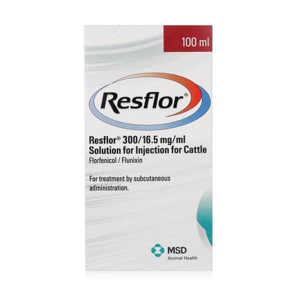 Resflor Solution for Injection is a combination product containing a broad spectrum antibiotic, florfenicol, and flunixin meglumine, a non-steroidal anti-inflammatory drug. Resflor is for the treatment of respiratory infections caused by Mannheimia haemolytica, Pasteurella multocida and Histophilus somni associated with raised body temperatures in cattle.The recommended dose for cattle is 40 mg