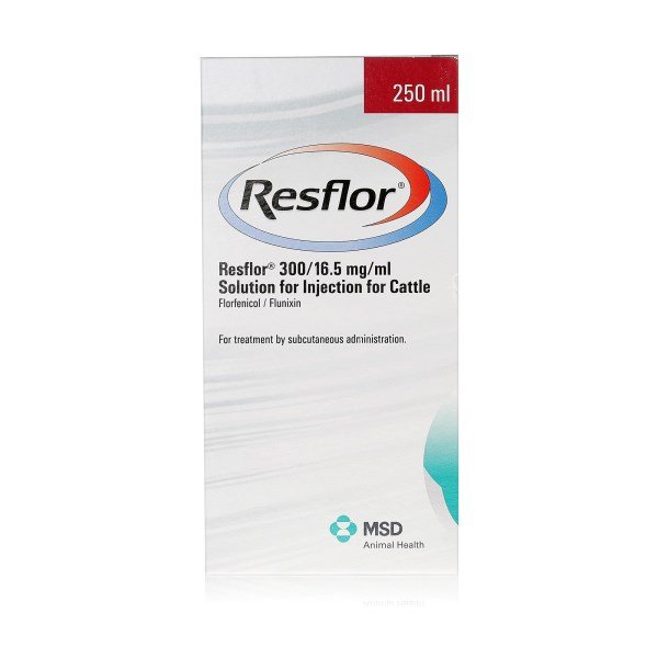Resflor Solution for Injection is a combination product containing a broad spectrum antibiotic, florfenicol, and flunixin meglumine, a non-steroidal anti-inflammatory drug. Resflor is for the treatment of respiratory infections caused by Mannheimia haemolytica, Pasteurella multocida and Histophilus somni associated with raised body temperatures in cattle.The recommended dose for cattle is 40 mg