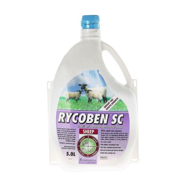 Rycoben is a broad spectrum fluke and worm control for the major benzimidazole-sensitive parasites of sheep including: Adult and immature gastro-intestinal roundworms: Bunostomum, Chabertia, Cooperia, Haemonchus, Nematodirus, Oesophagostomum, Ostertagia (Teledorsagia), Strongyloides and Trichostrongylus. Lungworms: Dictyocaulus filaria. Tapeworms: Moniezia spp. Adult liver fluke: Fasciola hepatica. Rycoben is ovicidal and is effective against mature and immature roundworms and lungworms. It is also effective against removing heads and segments of tapeworms. It controls adult liver fluke and treats chronic fasciolosis. Rycoben also aids in the prevention of cobalt and selenium deficiency.