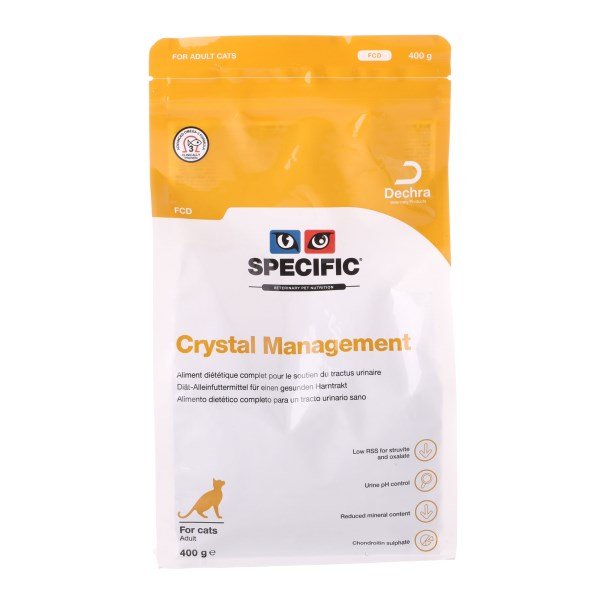 Specific Feline FCD Crystal Managementis a dry food to helpprevent the recurrence of struvite and calcium oxalate stones.This diet has a moderate sodium content making itsuitable for long term use. It has a reduced mineral content, particularly magnesium and phosphorus, to helpprevent crystals re-forming It creates a more acidic urine,helping to dissolve struvite stones Moderate salt cotent making itsafe for long-term use It containsOmega-3fatty acids from fish oil (EPA & DHA) for healthy coat skin and joint