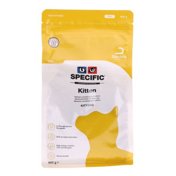 Specific Feline FPD Kitten is acomplete and nutritionally balanceddry food for kittens. With high levels ofprotein vitamins and mineralsfor growing kittens andOmega-3from fish oils supporting brain and eye development. For kittens from weaning to around 12 months or to neutering and for pregnant and lactating queens. It is made withhighly digestible ingredients. It is nutritionally concentrated so even with their small stomachs kittens canget the energy they need. It contains high levels ofOmega-3from fish to support brain and eye development. It contains added Yucca tominimise stool odour.