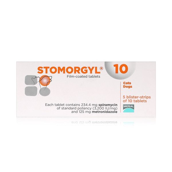 Stomorgyl tablets are for the treatment of periodontal and related oral conditions in dogs and catsMetronidazole has antimicrobial activity against most anaerobes, including Bacteroides, Fusobacterium and spirochaetes. Spiramycin has a therapeutic spectrum including Gram-positive aerobes such as staphylococci, streptococci and Bacillus, but also including anaerobes such as Actinomyces, Clostridium and Bacteroides. Antimicrobial synergy has been shown in vitro for many of these organisms.Weight RangeStomorgyl 2 - 1 tablet