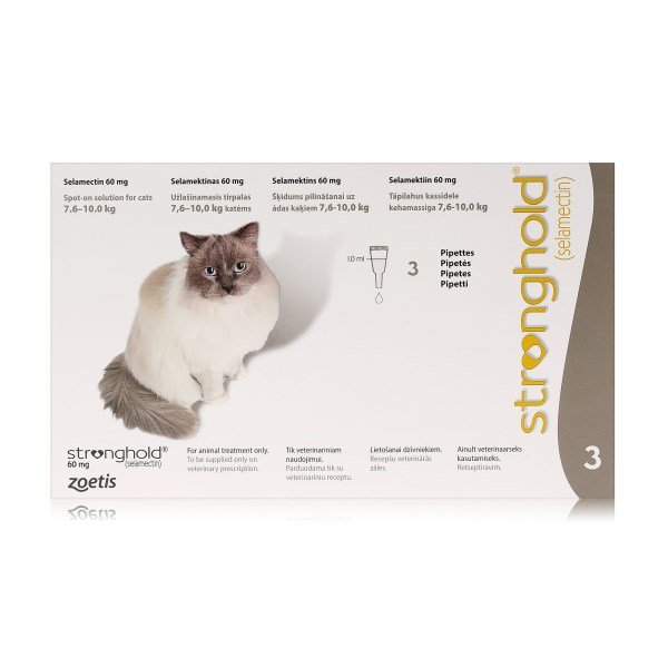 Stronghold is a colourless to yellow ready to use solution of selamectin. Stronghold is presented in a single use plastic tube for cutaneous (spot-on) administration to dogs and cats. For the treatment and prevention of flea infestations and roundworms for one month following a single administration. Stronghold is also ovicidal for 3 weeks after administration.For use as part of a treatment strategy for flea allergy dermatitis and through its ovicidal and larvicidal action may aid in the control of existing environmental flea infestations in areas to which the animal has access. For the treatment of ear mites (Otodectes cynotis). Also for the prevention of heartworm disease caused by Dirofilaria immitis with monthly administration.Weight RangesKittens & Puppies weighing ¤ 2.5 kg - 1 tube of Stronghold 15 mg (Rose coloured top)Cats weighing 2.6 7.5 kg - 1 tube of Stronghold 45 mg (Blue coloured top)Cats weighing 7.6 - 10.0 kg - 1 tube of Stronghold 60 mg (Taupe coloured top)Dogs weighing 2.6 5.0 kg - 1 tube of Stronghold 30 mg (Violet coloured top)Dogs weighing 5.1 10.0 kg - 1 tube of Stronghold 60 mg (Brown coloured top)Dogs weighing 10.1 20.0 kg - 1 tube of Stronghold 120 mg (Red coloured top)Dogs weighing 20.1 40.0 kg - 1 tube of Stronghold 240 mg (Green coloured top)Dogs weighing 40.1 - 60.0 kg - 1 tube of Stronghold 360 mg (Plum coloured top)Dogs weighing > 60.0 kg - Appropriate combination of tubes