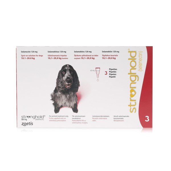 Stronghold is a colourless to yellow ready to use solution of selamectin. Stronghold is presented in a single use plastic tube for cutaneous (spot-on) administration to dogs and cats. For the treatment and prevention of flea infestations and roundworms for one month following a single administration. Stronghold is also ovicidal for 3 weeks after administration.For use as part of a treatment strategy for flea allergy dermatitis and through its ovicidal and larvicidal action may aid in the control of existing environmental flea infestations in areas to which the animal has access. For the treatment of ear mites (Otodectes cynotis). Also for the prevention of heartworm disease caused by Dirofilaria immitis with monthly administration.Weight RangesKittens & Puppies weighing ¤ 2.5 kg - 1 tube of Stronghold 15 mg (Rose coloured top)Cats weighing 2.6 7.5 kg - 1 tube of Stronghold 45 mg (Blue coloured top)Cats weighing 7.6 - 10.0 kg - 1 tube of Stronghold 60 mg (Taupe coloured top)Dogs weighing 2.6 5.0 kg - 1 tube of Stronghold 30 mg (Violet coloured top)Dogs weighing 5.1 10.0 kg - 1 tube of Stronghold 60 mg (Brown coloured top)Dogs weighing 10.1 20.0 kg - 1 tube of Stronghold 120 mg (Red coloured top)Dogs weighing 20.1 40.0 kg - 1 tube of Stronghold 240 mg (Green coloured top)Dogs weighing 40.1 - 60.0 kg - 1 tube of Stronghold 360 mg (Plum coloured top)Dogs weighing > 60.0 kg - Appropriate combination of tubes