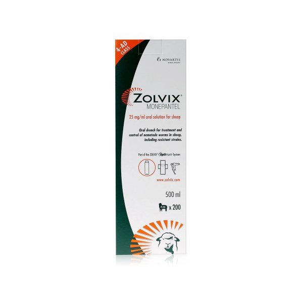 ml monepantel. Zolvix is a broad spectrum anthelmintic for the treatment and control of gastro-intestinal nematode infections and associated diseases in sheep including lambs, hoggets, breeding rams and ewes.Recommended Dosage and AdministrationZolvix should be administered orally to sheep as a single treatment, however the administration may be repeated, depending on the epidemiological situation in different areas. To ensure complete swallowing of this low volume solution, Zolvix should be administered using an appropriate drench gun on the back of the tongue. Accuracy and proper functioning of the dosing device should be checked and the drenching equipment should be cleaned after use. If animals are to be treated collectively rather than individually, they should be grouped according to their bodyweight and dosed according to the heaviest animal within the group in order to avoid underdosage. (The Zolvix Optiline Drencher is also available on site.)The recommended dose rate is 2.5mg per kg bodyweight of monepantel according to the following recommendations:10-15kg Bodyweight - 1.5ml Dose16-20kg Bodyweight - 2ml Dose21-25kg Bodyweight - 2.5ml Dose26-30kg Bodyweight - 3ml Dose31-35kg Bodyweight - 3.5ml Dose36-40kg Bodyweight - 4ml Dose41-50kg Bodyweight - 5ml Dose51-60kg Bodyweight - 6ml Dose61-70kg Bodyweight - 7ml Dose>70kg Bodyweight - 1 ml for each additional 10 kgPlease see product leaflet for detailed dosages, Contra-indications and warnings